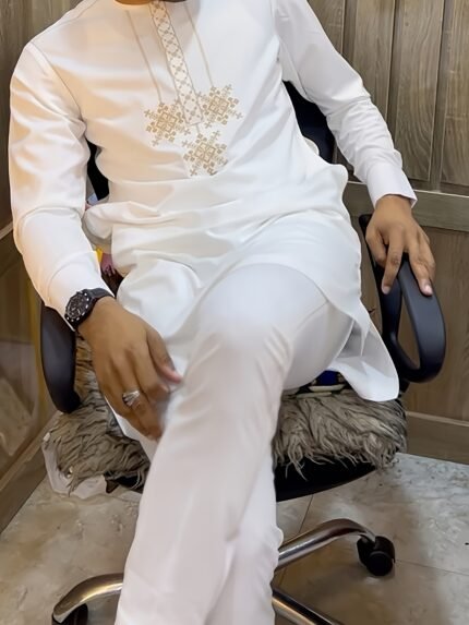 [Geometric Robe] Two-Piece Men’s Long-Sleeve Geometric Pattern Robe And Solid Color Pants Traditional Outfit, Formal Wear | Round Neckline Outfit | Machine Washable