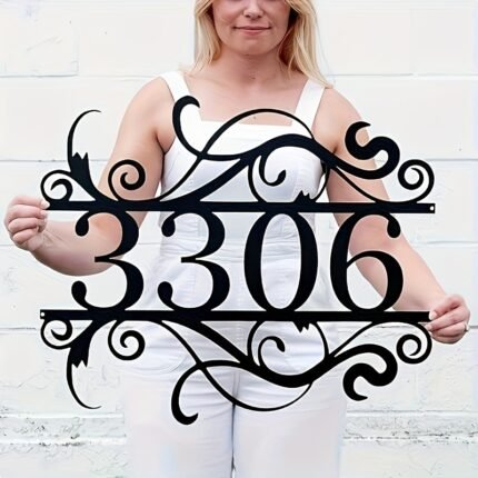 Custom Metal House Number Sign – Vintage Industrial Style, Easy Wall Mount with Drill Holes, No Batteries Needed, Outdoor & Door Decor, Black Ornate Frame with Decorative Swirls, Metal Wall Art Decor