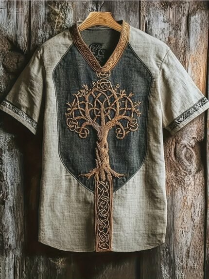 Men’S Celtic Style Short Sleeved Top – Grey Base Color, Dark Areas And Golden Tree Of Life Pattern, Exquisite Craftsmanship, Full Of Mystery And Ancient Charm, Showcasing Unique Cultural Taste