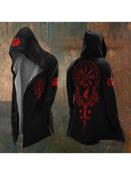 Men’S Medieval Viking Hooded Cardigan – Heavy-Duty Norse Warrior Costume Jacket with Hood, Long Sleeve Viking Cloak for Renaissance Fairs, Themed Parties & Casual Attire – Autumn/Winter Warmth – Historical Viking Clothing with Intricate Viking Knot Patterns, Red & Black Color Options, and Functional Hood for Casual & Formal Events – Mid-Length Print Design with Viking-Inspired Motifs, Regular Fit for Men, Ideal for Cooler Seasons, Stylish and Comfortable for Casual and Formal