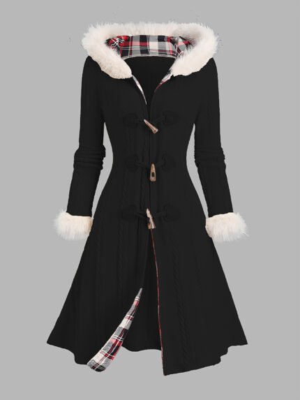 Y2K-Inspired Plaid Patchwork Hooded Coat with Horn Buttons – Long Winter Coat for Women, Red & White Checkered Pattern, Cozy Fall/Winter Outerwear, Cozy Winter Wear | Y2K Fashion | Construction, Winter Coats