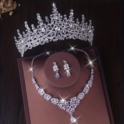 High end Luxury Crown Necklace Earring Set Bride Wedding Dress Jewelry Wedding Necklace Wedding Jewelry High end Grand Dinner Banquet Birthday Crown Necklace Earring Set of Three