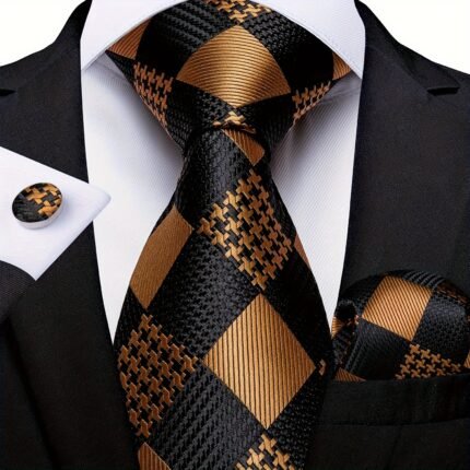 Men’s Classic Striped Black Brown Tie Set with Matching Pocket Square & Cufflinks – Elegant Checkered-Like Pattern in Black, Brown & Golden, Versatile Formal & Business Casual Necktie Accessories, 3pcs Luxury Gift Set, Designer Tie Set, Silvery Satin Ties for Men, Bow Tie for Men, Striped Ties for Men, Brown Ties for Men, Wedding Attire, Professional Wardrobe, Sophisticated Design, Durable Construction, Highquality Accessories, Stylish Gentlemen