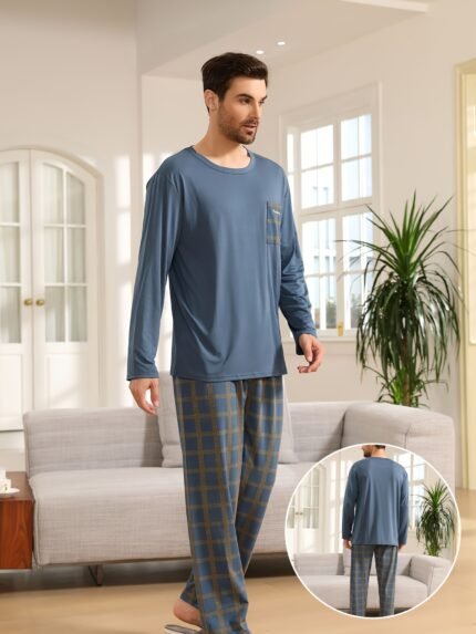 Men’s Casual Pajama Set – Long Sleeve & Pants, Cozy Polyester Blend, Machine Washable, Round Neck Pullover with Pockets – Perfect for Spring/Fall – For Men – Ideal for Relaxing at Home – Great Gift for Birthday or Holidays