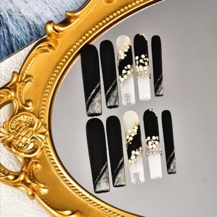 10Pcs/1Pair High Quality Handmade Wearable Nails, Nail Patches, Removable Nail Patches, Press-On False Nails, Black White Long Nails, Golden Stickers with Glittering Diamonds Decoration, Exquisite Ladies Decorative Long Nails, Free Nail Patch Tools
