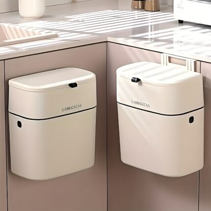 1pc Hanging Garbage Can, Space Saving Kitchen Garbage Can for Kitchen Cabinet Door Under Sink Garbage Can, Plastic Compost Bin with Adhesive Backing Hooks, Odor Barrier, Silent Closing, Push to Open, Perfect for Kitchens, Bathrooms, Offices