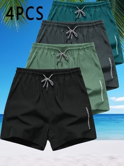 [Comfortable Athletic Shorts] 4pcs Men’s Athletic Shorts – Comfortable, Loose Fit – Black with White Drawstring and Pockets for Running & Beach Activities