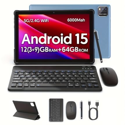 2025 Tablet Android 15 Tablets with 64GB ROM+(3+9)GB RAM, 1TB Expand 2in 1 10 Inch Tablet with Keyboard, Mouse, Case, Stylus, Pen, Powerful Quad-Core, 5G WiFi 6, 6000mAh, 2MP+8MP Dual Camera, 1280 * 800 FHD IPS Screen