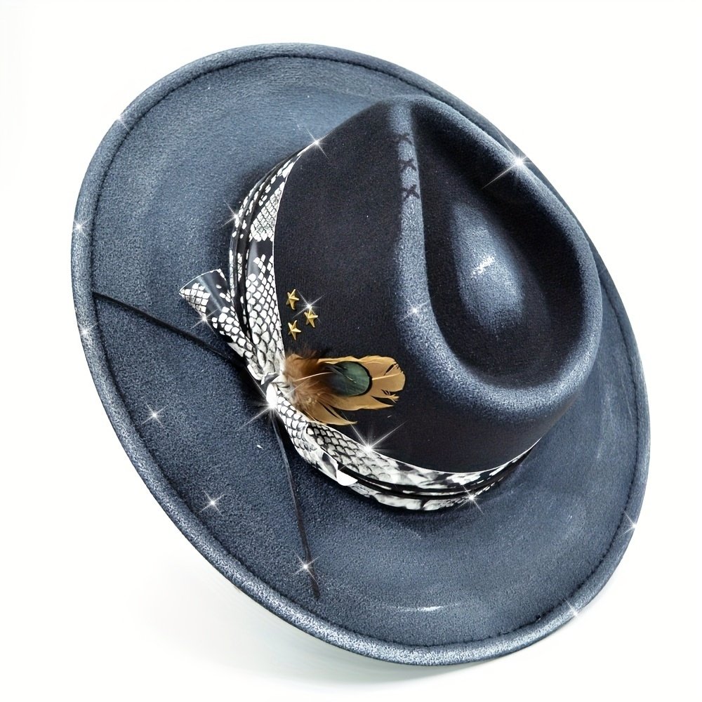 womens vintage distressed fedora with hand painted graffiti pu accents 100 polyester inelastic holiday prom hat with lightweight artificial feather decoration non washable knitted star embellished holiday occasion hat
