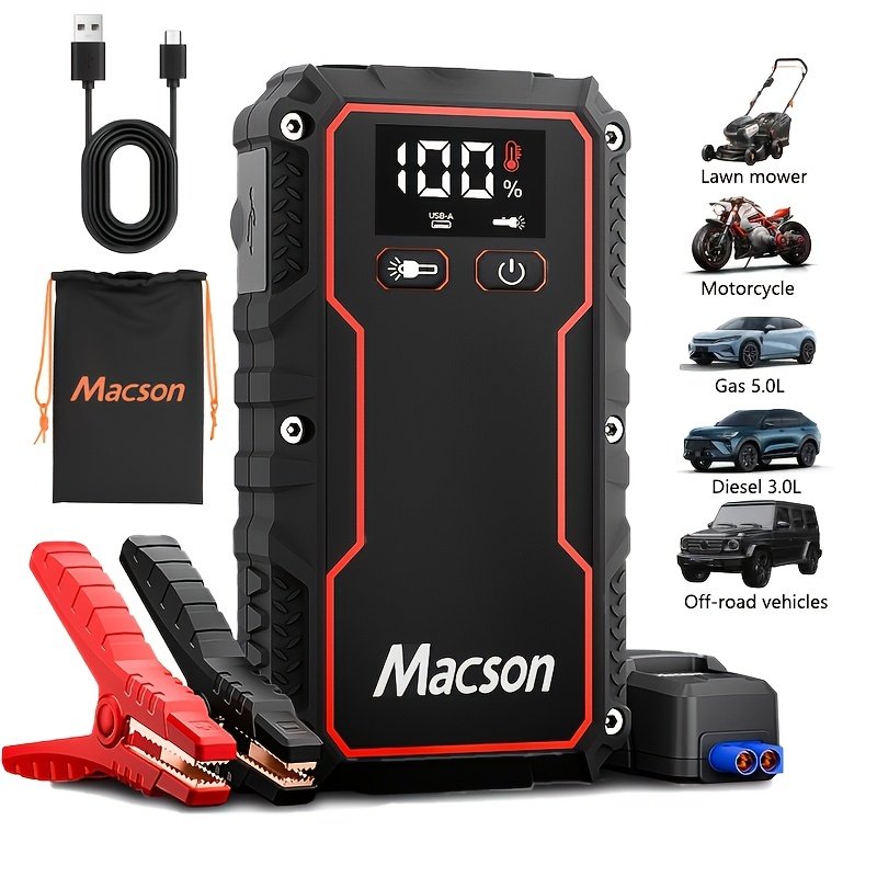 12V New Car Jump Starter, 1000A Portable Jump Starter For 5.0L Gasoline/3.0L Diesel Cars, USB Type-C And USB Output, 5 Modes Flashlight, LED Display, Rechargeable Lithium Polymer Battery.