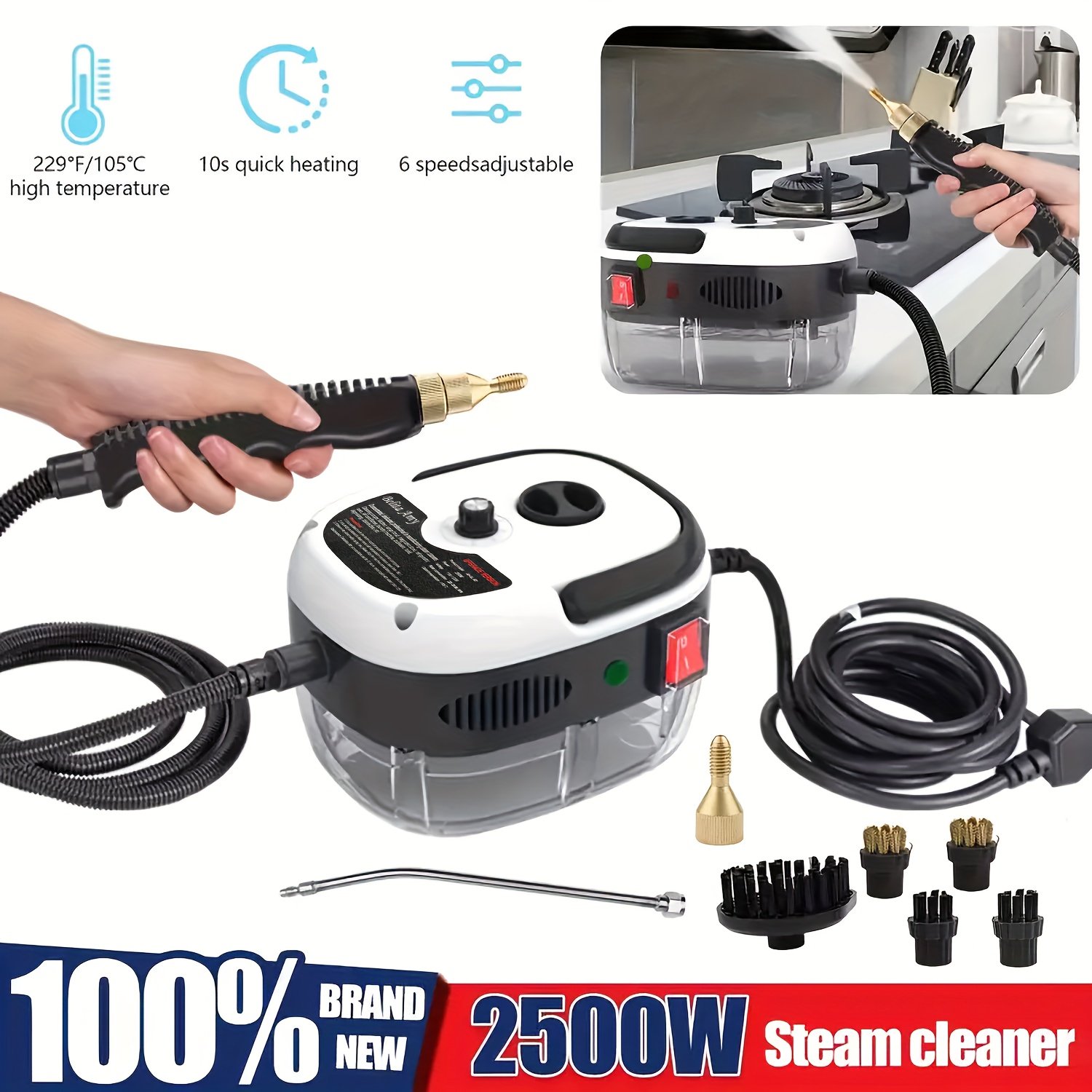1pc 2500W Heavy-Duty Steam Cleaner with – Quick Heat-Up (10s Fast Heating), Extreme High-Temp (229°F/105°C), 3 Brush Heads, Large Tank, Portable Handheld Steam Cleaning Machine for Kitchen, Bathroom, Car, Floors, Appliances – US Plug (110V) – Ideal for Home, Office, Auto Detailing, Home Sanitizing Device, Compact Design, Durable Construction, Car Enthusiasts