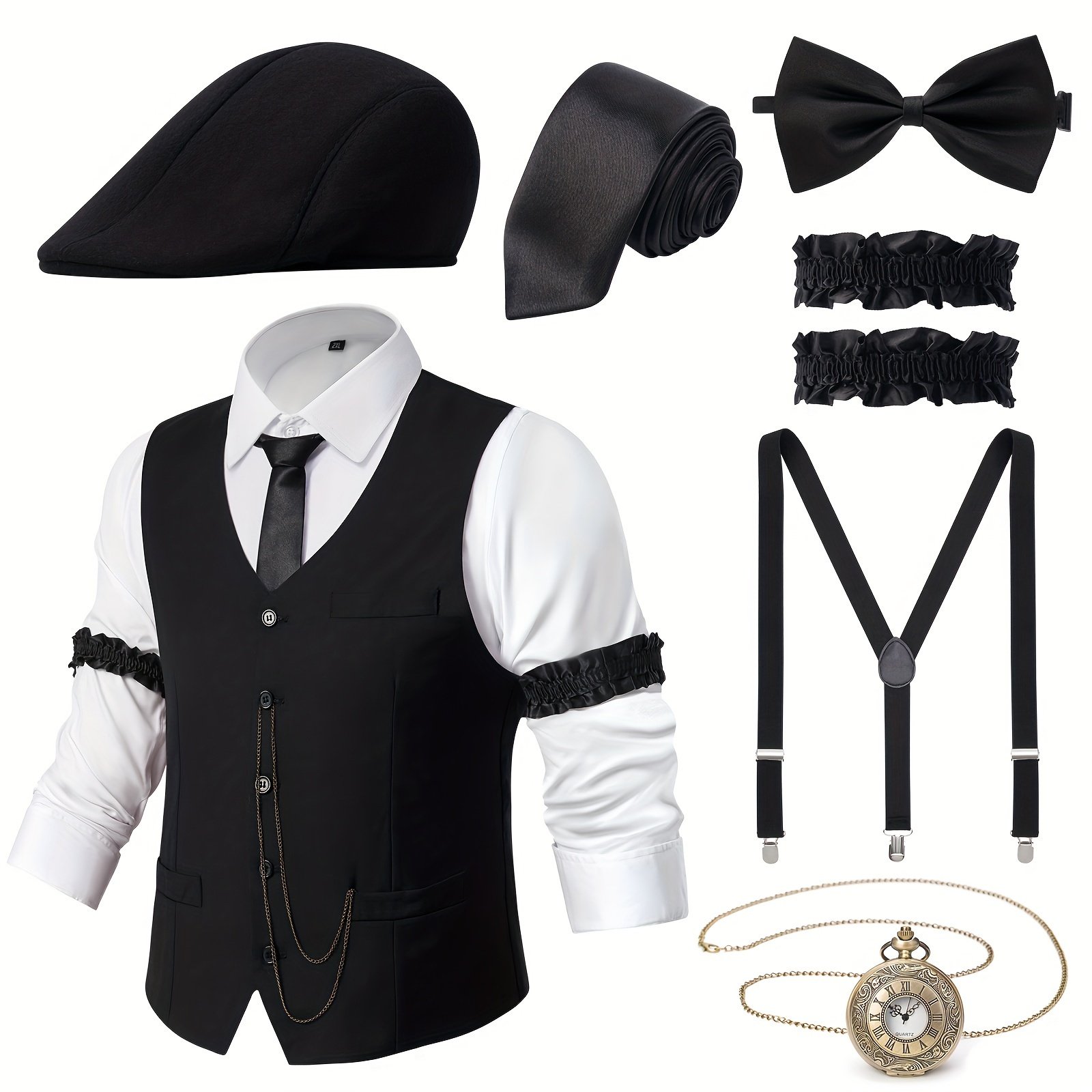 1set 1920s costume accessories for men polyester street style vest hat bow tie pocket watch suspenders and arm bands roaring 20s themed outfit shirt not included
