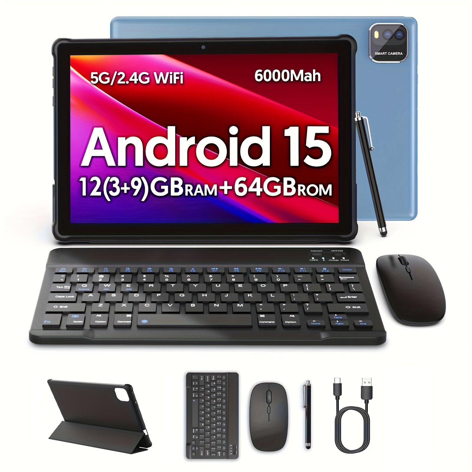 2025 Tablet Android 15 Tablets with 64GB ROM+(3+9)GB RAM, 1TB Expand 2in 1 10 Inch Tablet with Keyboard, Mouse, Case, Stylus, Pen, Powerful Quad-Core, 5G WiFi 6, 6000mAh, 2MP+8MP Dual Camera, 1280 * 800 FHD IPS Screen