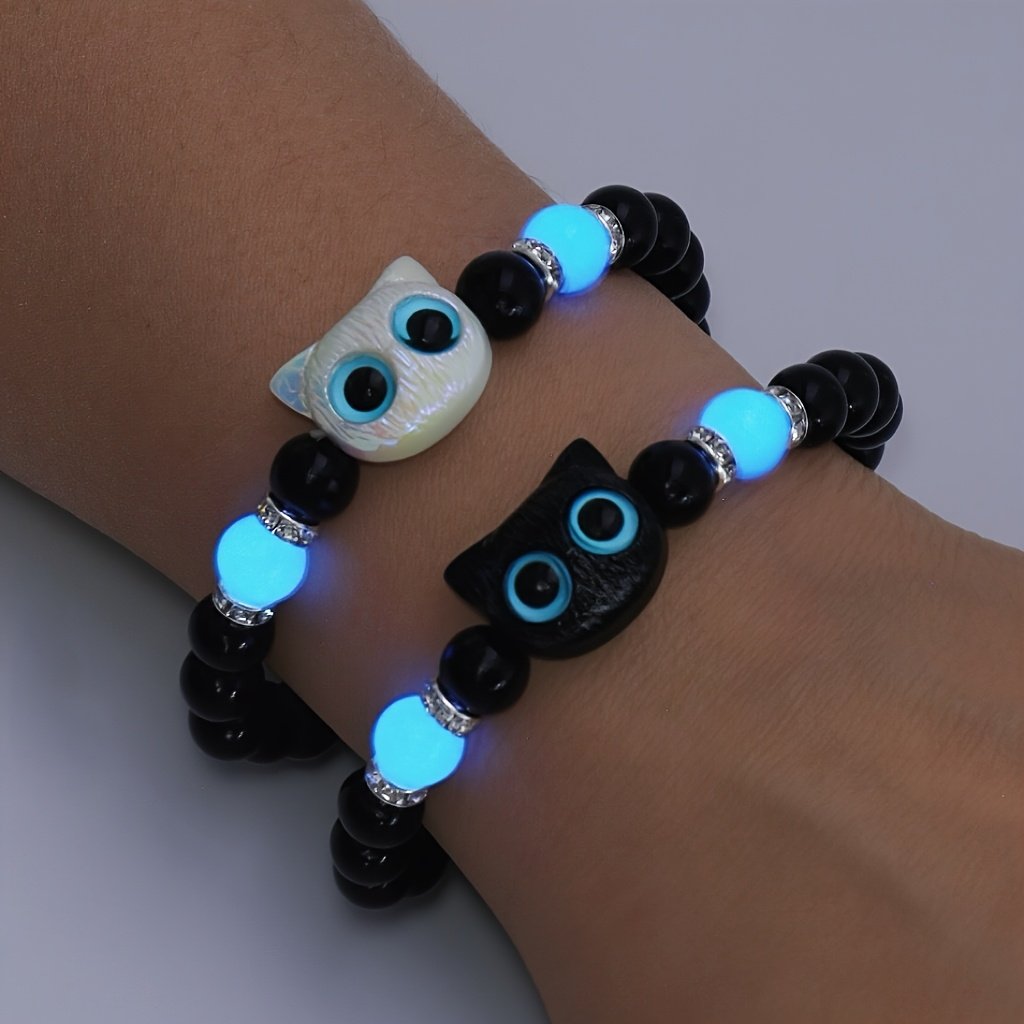 [2pcs, Glowing Cat Bracelets] 2pcs Set, Glowing Black and White Cat Jewelry Bracelets for Couples or Sisters, Adjustable Stretch, Perfect Holiday Gift