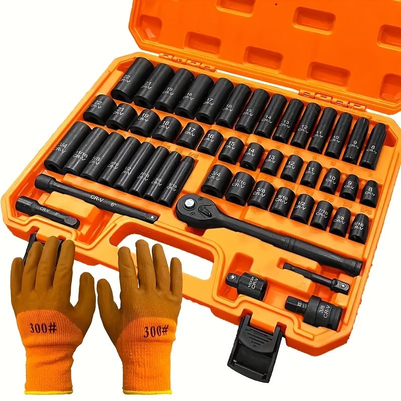 3/8″ Drive Impact Socket Set, 50pcs Standard SAE (5/16 To 3/4 Inch) And Metric (8-22mm) Size, 6 Point, Cr-V, 3/8-Inch Drive Ratchet Handle, Drive Extension Bar, Impact Universal Joint. With Gloves