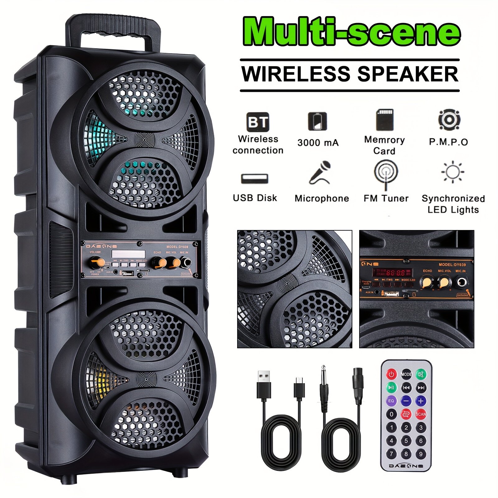 3000W Portable Bluetooth Speaker with Double 6.5 ” Subwoofer Stereo Sound, Outdoor Party Speaker, Support FM Radio, LED Colorful Lights, with Microphone, Support for TF/FM Radio/USB/AUX, for Home, Party, Travel, Chrismas Party