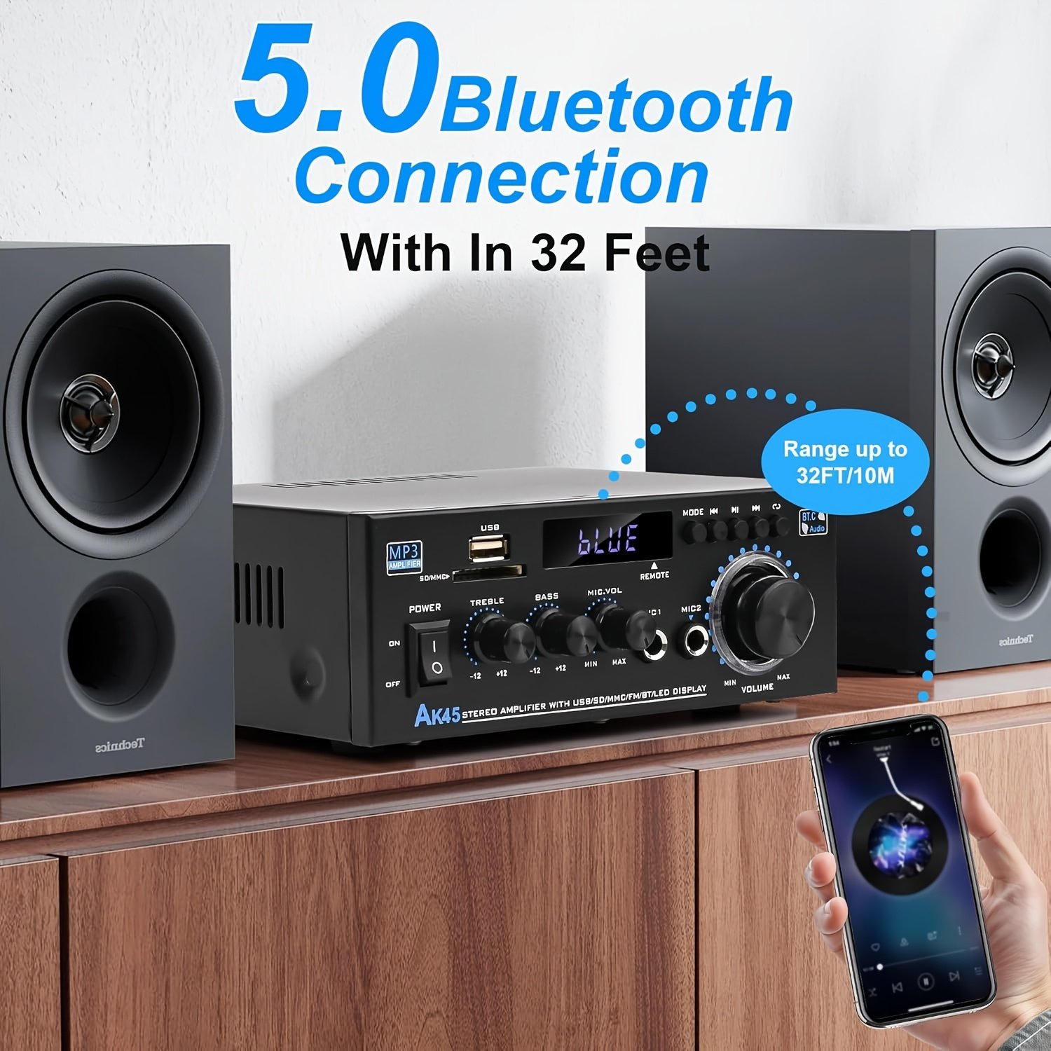 3D Sound Stereo Amplifier 2025 Upgraded AK45 Wireless Receiver, Suitable for Home Stereo, 400W Dual Channel Wireless 5.0 Power Amplifier System with FM Radio, USB, SD Card and Remote Control