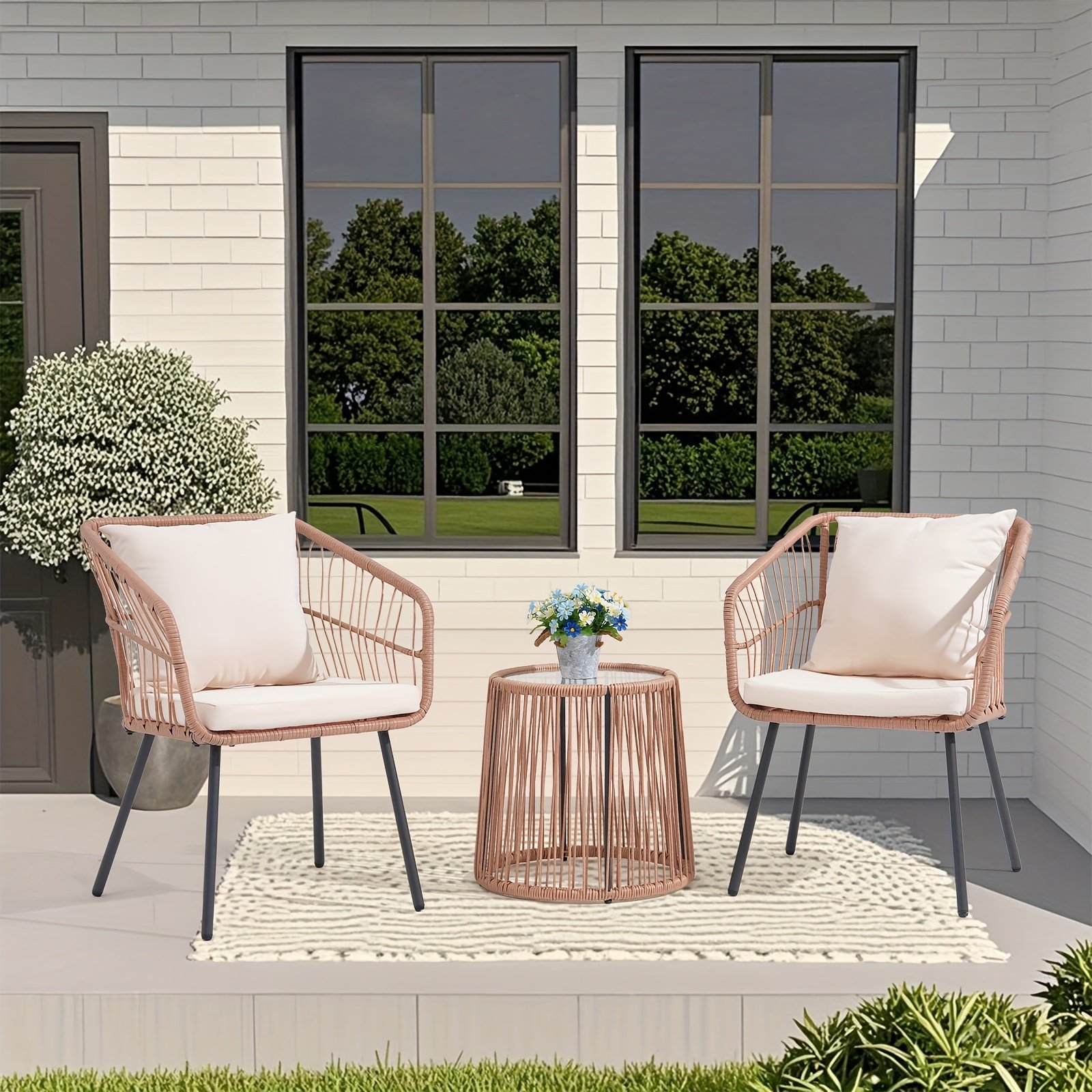 3pcs PE Wicker Patio Furniture Set with 2 Armchairs & Glass-Topped Side Table – All-Weather Metal Frame & Wicker Outdoor Conversation Set in Beige/Copper Brown – Cushioned Seats for Porch, Balcony, Backyard, Poolside – Durable & Comfortable Modern Set with Woven Rattan Backrests and Neutral Beige Cushions for Stylish Outdoor, Patio Furniture And Decor, Patio Furniture Set Small Table Modern Design, Table Balcon Chaise, Lounge Furniture, White Patio Furniture Set,