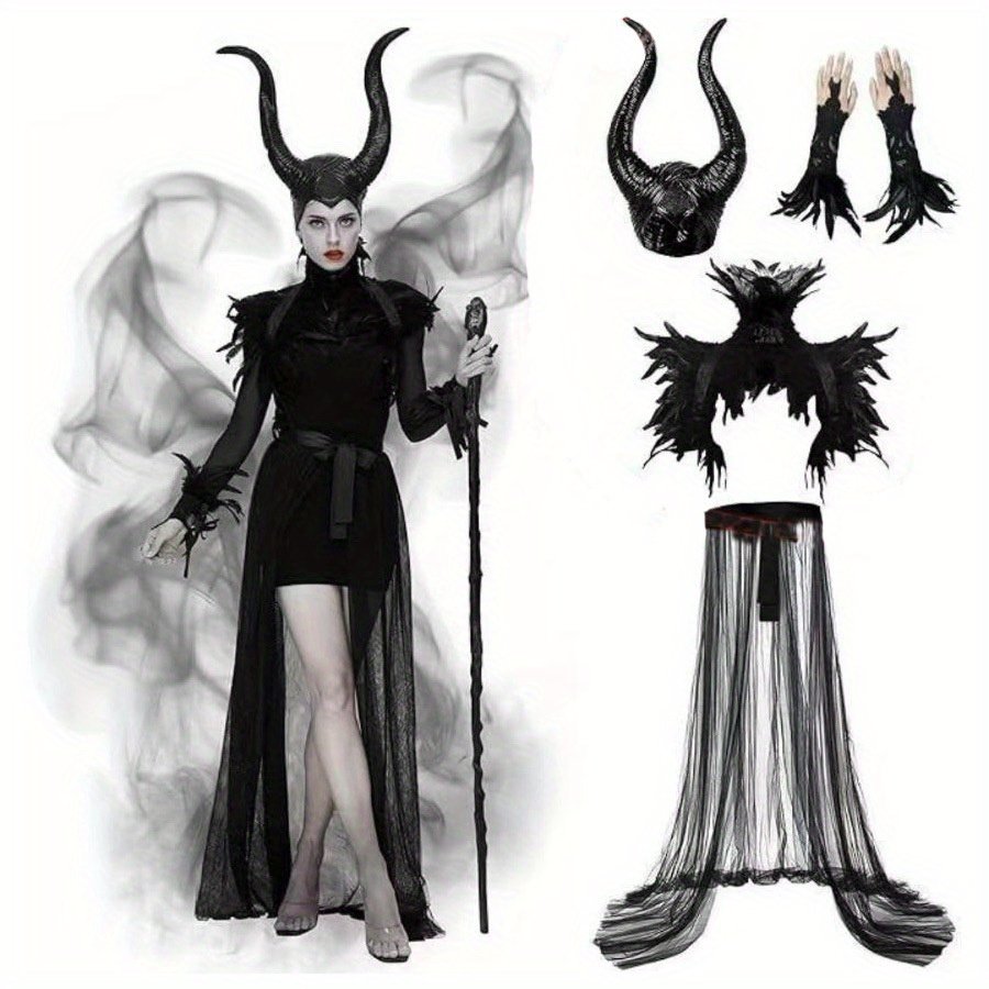 4pcs Halloween – Elegant Gothic Witch Dress with Cowl, Wings, Lace Sleeves & Feather Shawl, Black Mesh Poncho for Halloween Parties, Balls, Themed Events – Formal Attire, Halloween Costumes, Themed Event Attire, Dramatic Silhouette, Intricate Detailing, Party Attire, Fabric, Cosplay Enthusiasts