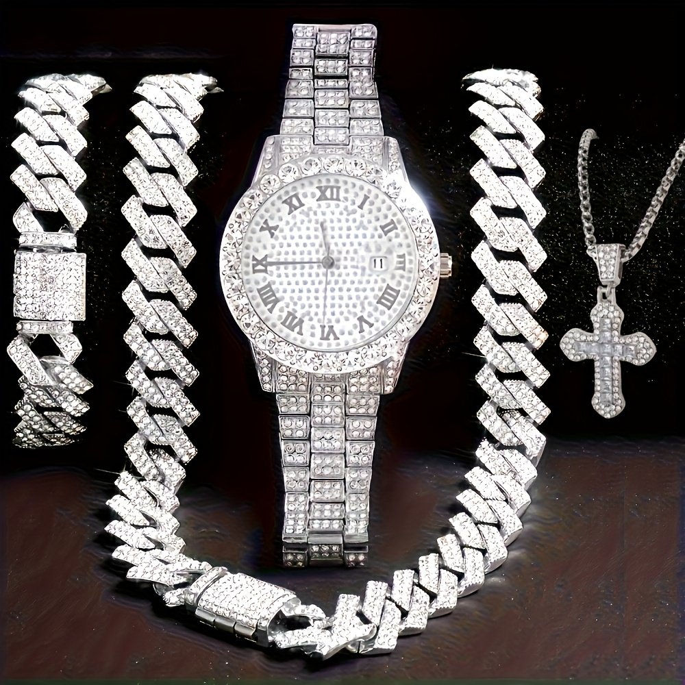 4pcs hip hop watch jewelry set punk cuban chain bracelet inlay watch for men women trend party gift