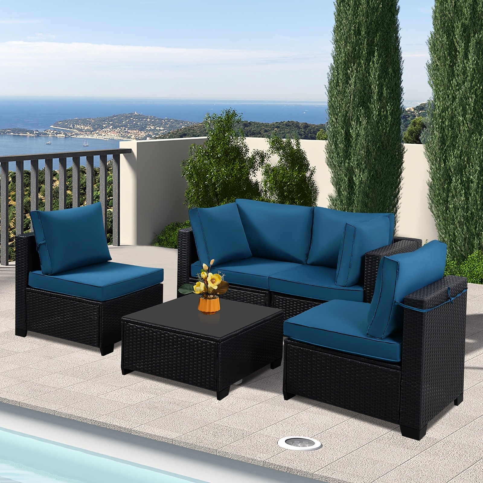 5pcs Patio Furniture Set, Outdoor All-Weather Wicker Patio Conversation Setswith Washable Cushions And Glass Coffee Table, Patio Conversation Couch For Balcony, Porch, Backyard