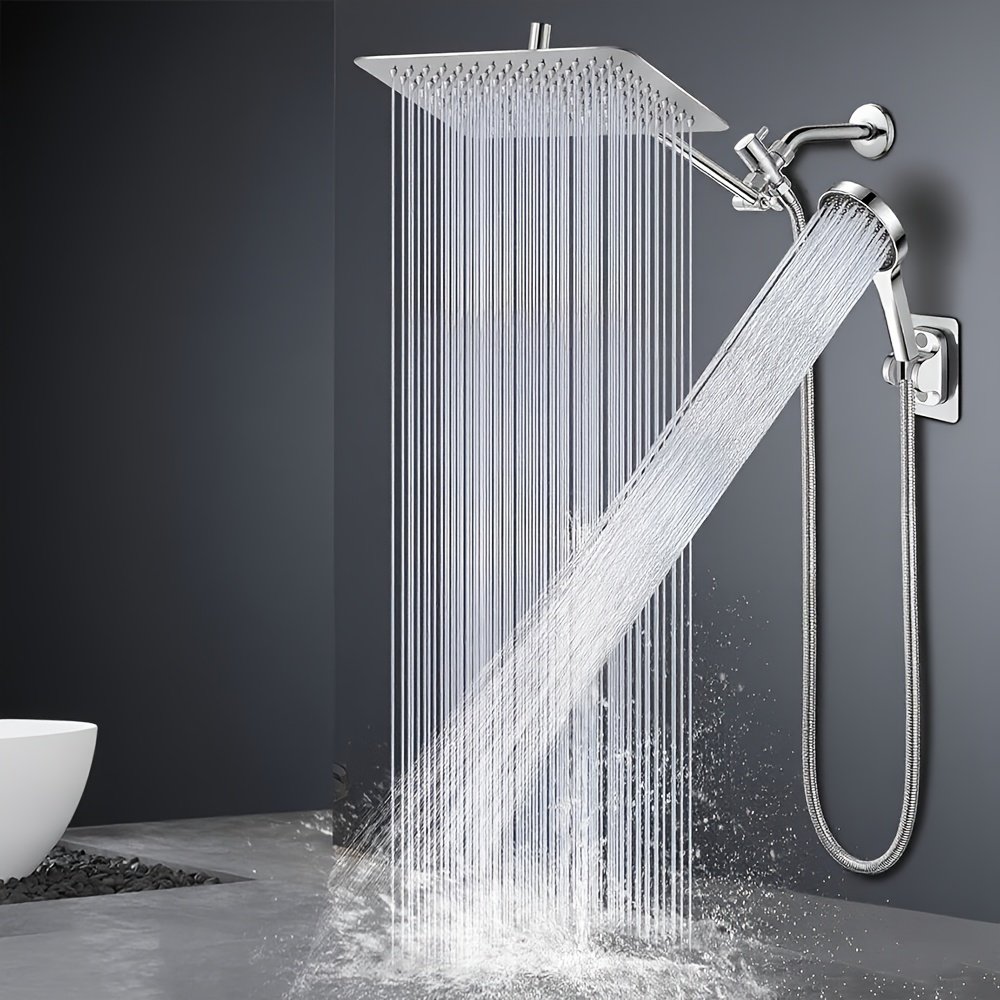 8/12 Inch High Pressure Rainfall Shower Head & Handheld Shower Combo with 11 Inch Extension Arm, 5-Setting Adjustable Anti-Leak Shower Head with Holder/Hose, Height/Angle Adjustable, Stainless Steel, Wall-Mounted, Contemporary Design, No Electricity Needed, Shower Head for Bathroom, Modern Bathroom Accessory, Sleek Metallic Finish, Durable Construction