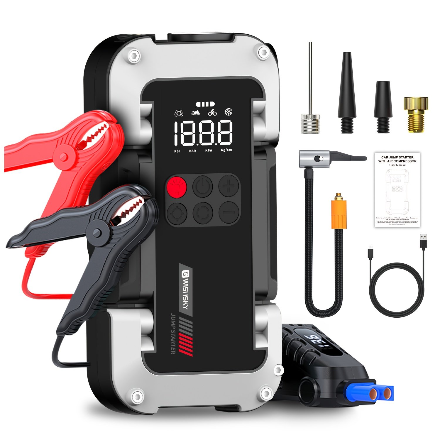 9000A Peak Portable Car Jump Starter with Air Compressor (150PSI), LED Light, USB &Type-C, Power Bank, Jump Starter for Cars, Trucks, SUVs, Boats, RVs, 5-in-1 Emergency Battery Booster Pack for Vehicle Rescue, Outdoor Emergency, Car Jump Starter Portable, Portable Car Battery Jump Starter, Car Jump Starter Battery Pack, Car Jump Starter, Portable Car Jump Starter, Vehicle Rescue Tool, Emergency Power Bank, Multifunctional Device, Compact Design