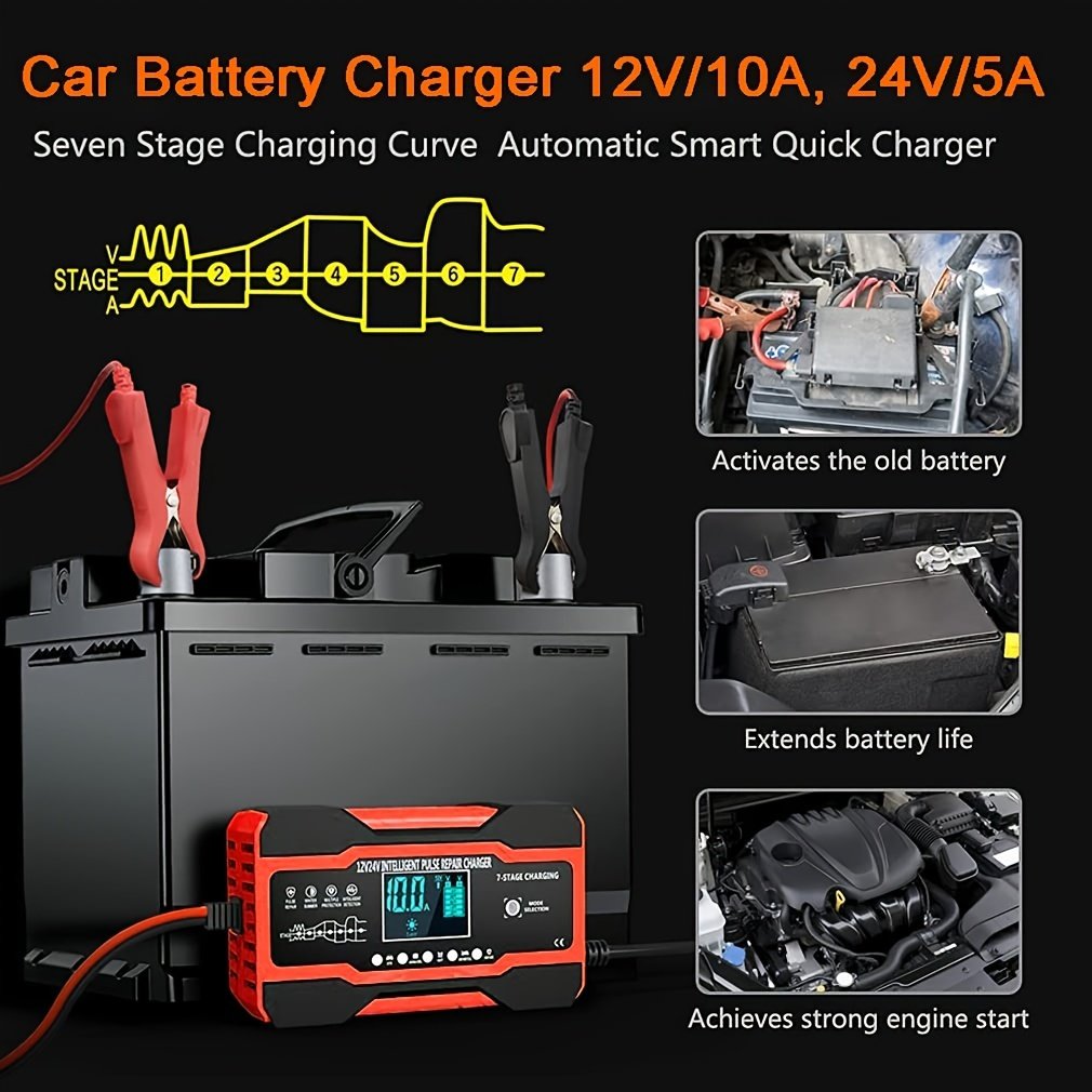 battery charger for cars a new 10a model suitable for 12v 24v batteries featuring repair an icd display and smart fast charging capabilities for deep cycle gel lead acid batteries in red or yellow its automotive tools holiday gifts and used with vehicles motorcycles lawn mowers and marine equipment without battery