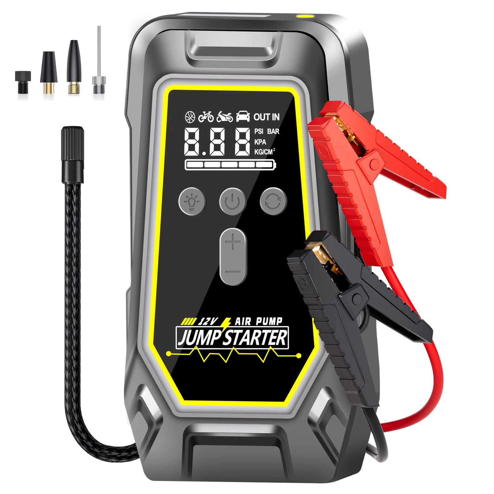 car emergency starter with air compressor 150psi car battery emergency starter for 8 0 gasoline 5 0l 12v jump box car battery emergency starter portable with jumper cables large lcd display led lights