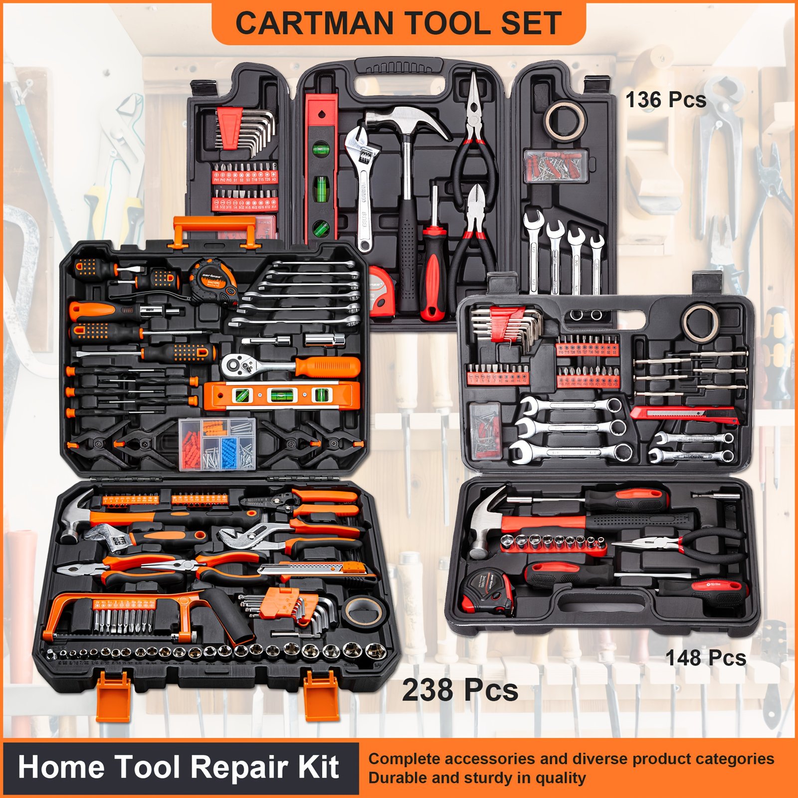 CARTMAN 12/52/136/148/152/238pcs Tool Set General Household Hand Kit with Plastic Toolbox Storage Case