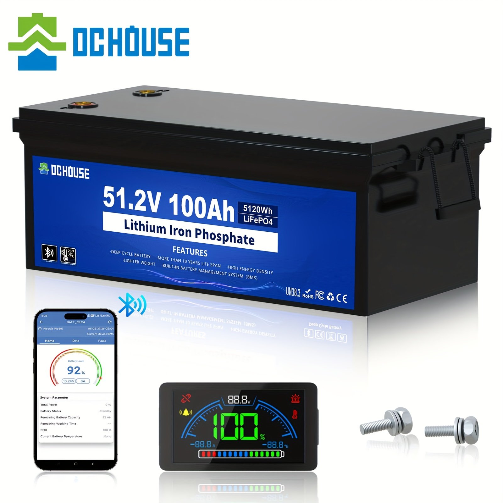 DC HOUSE 48V 100Ah Lithium Golf Cart Battery with Wireless, Lithium Iron Phosphate (LiFePO4), Built-in LCD Monitor & 200A BMS, Heavy-Duty Deep Cycle Battery, Compatible with Club Car, Yamaha, RV, Marine, Off-Grid – Lightweight, Long-Lasting for Golf Carts, Trucks, Boats, Solar Systems, Marine Power Supply, Modern Power Solution, Highperformance Energy Storage, Smart Power Management, Truck Drivers