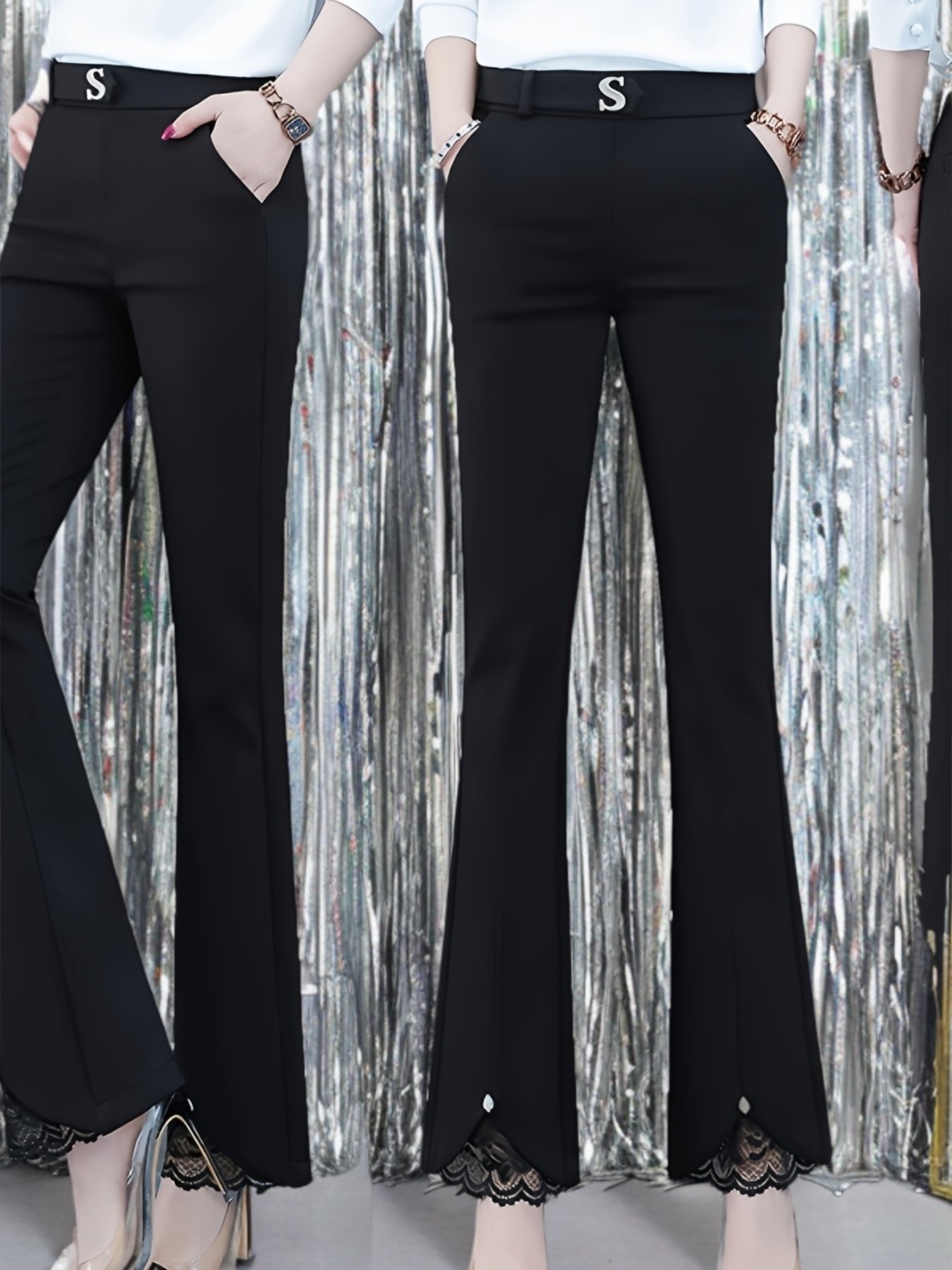 womens high waist flare pants elegant black straight leg trousers with lace hem stretchy nylon blend casual to semi formal wear