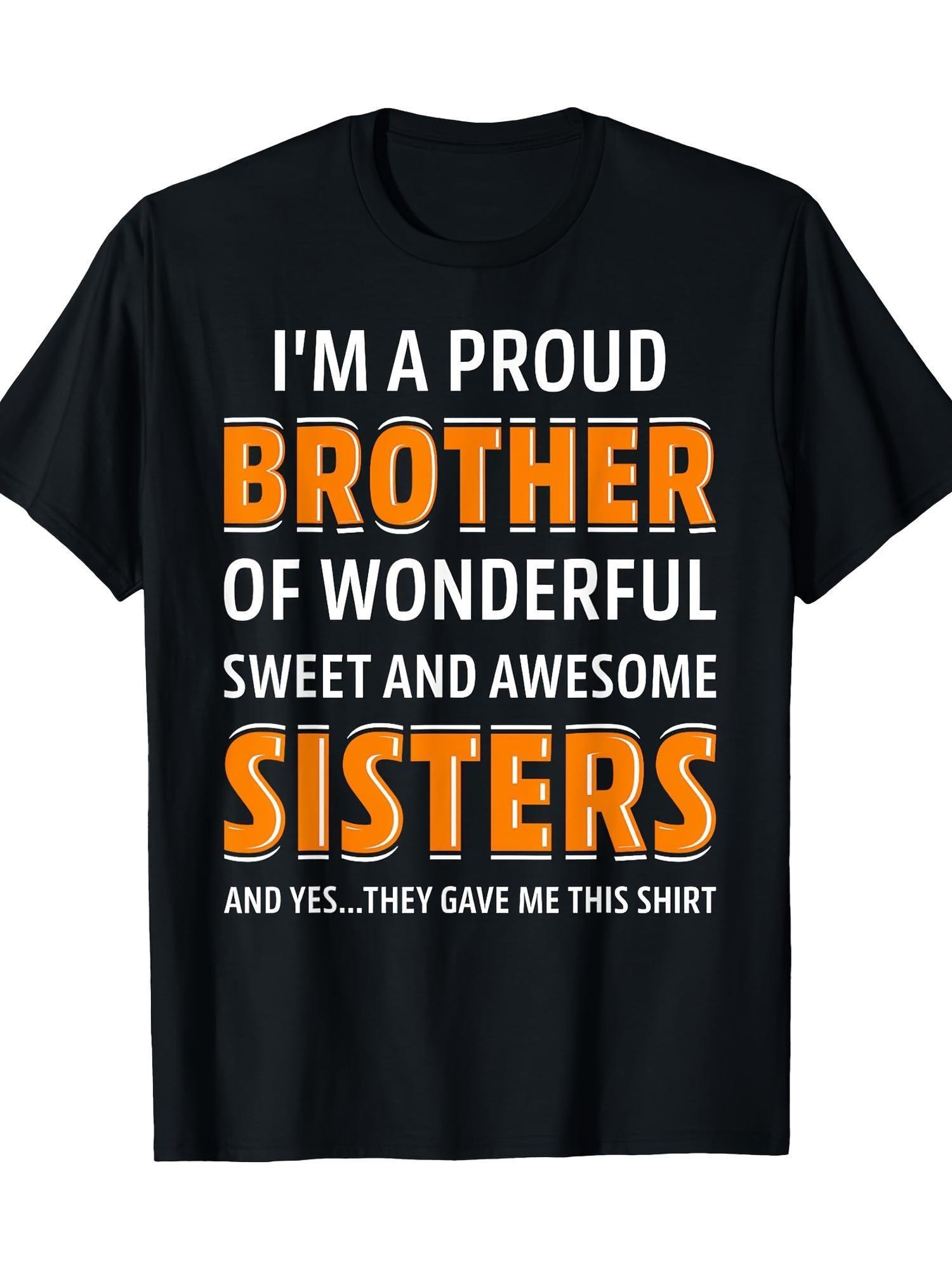 Funny Sibling Birthday Gift T-Shirt – “Proud Brother of Wonderful Sweet Sisters” Funny Quote Tee – Black Shirt with Orange/White Text – Soft Stretch Knit Fabric – Regular Fit Crew Neck Top for Brothers – Casual Everyday Brother Apparel, Playful Graphic Shirt, Comfortable Brother Shirt, Humorous Apparel, Short Sleeve, Breathable Material, Family Humor