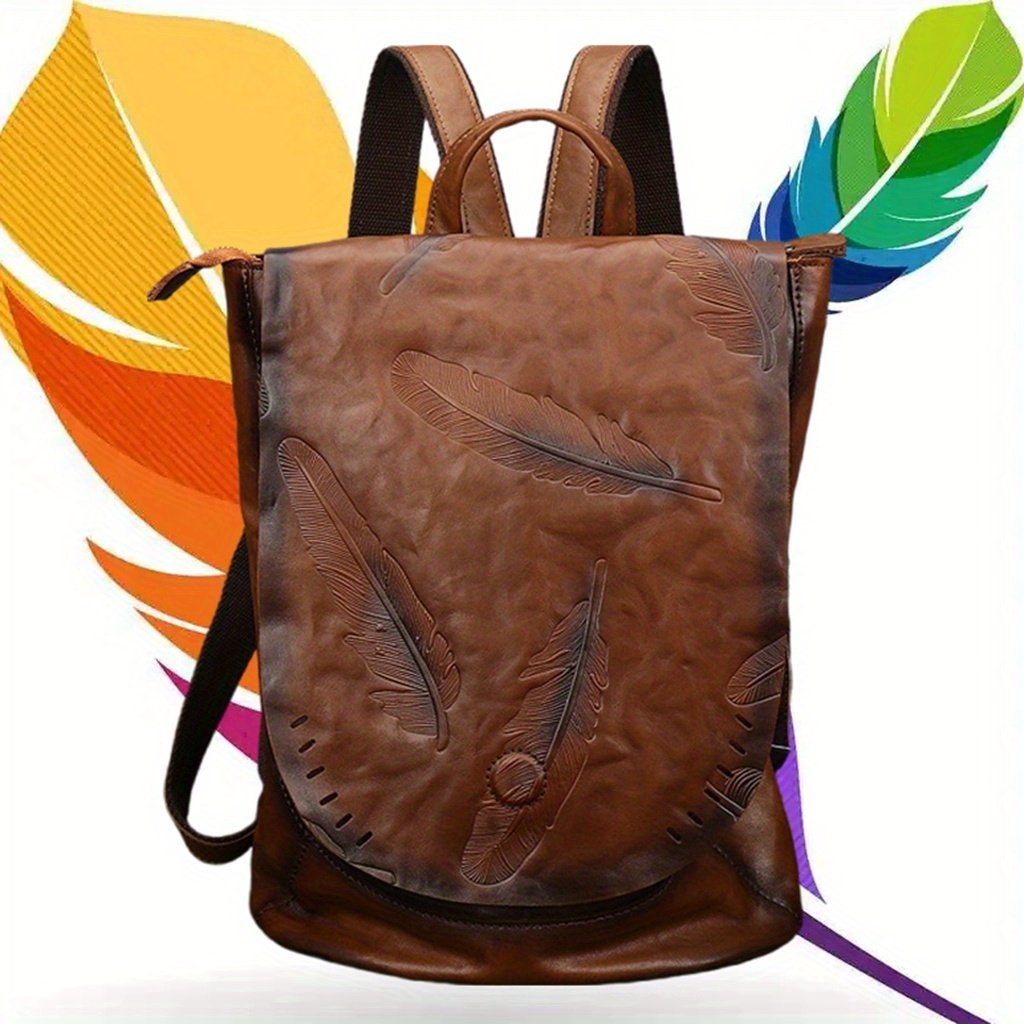 Genuine Genuine Leather Backpack for Women – Vintage Style Large Capacity Travel Bag with Artistic Feather Print, Brown & Black Options, Adjustable Straps, Zip Closure, Boutique Design, Travel Backpack