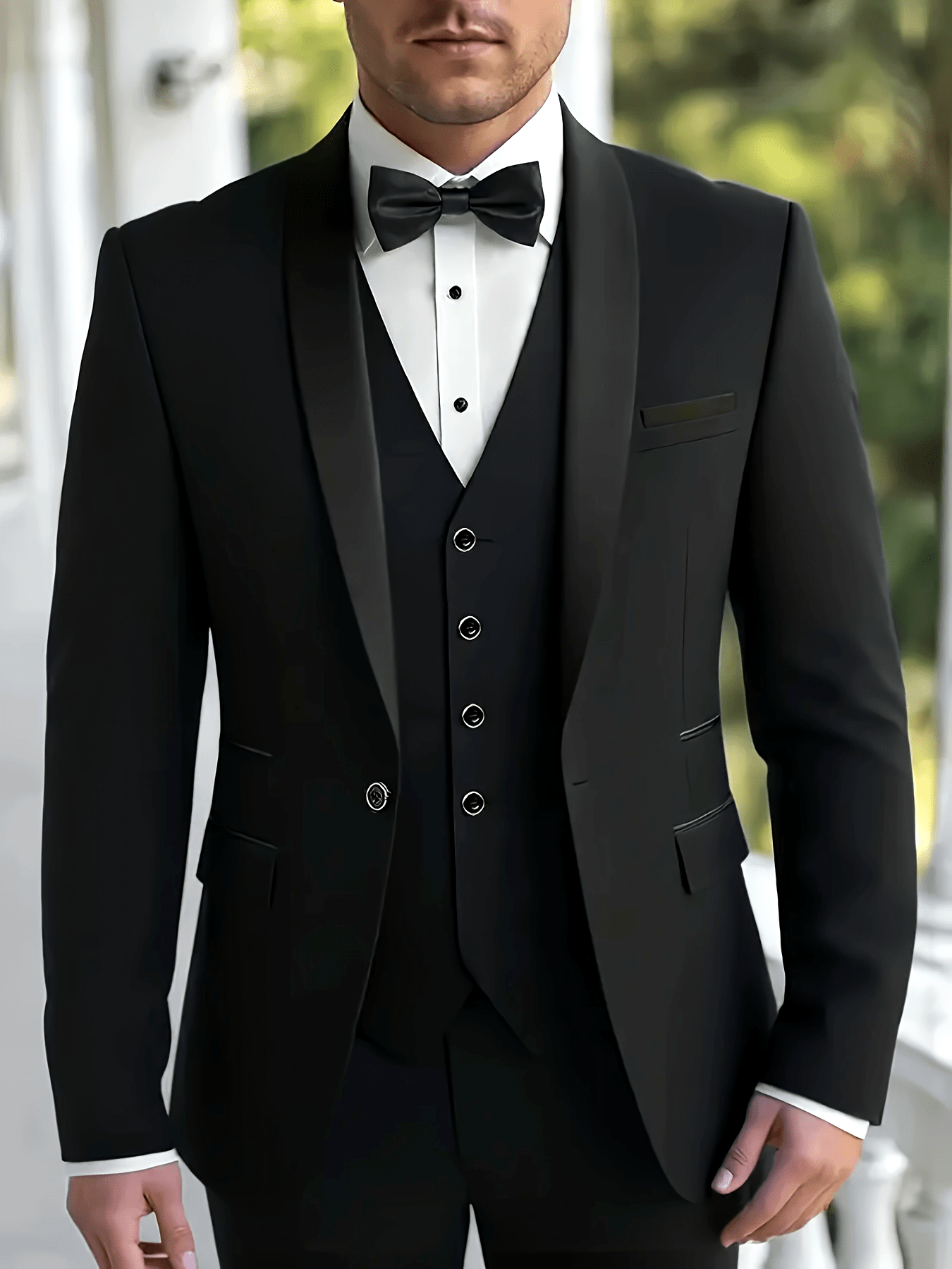 Men’S Elegant Three-Piece Black Tuxedo Suit with Bow Tie – Perfect for Weddings, Formal Events, and Work Attire – Includes Vest, Dress Shirt, and Pants, Formal Attire|Classic Tuxedo|Sophisticated Style