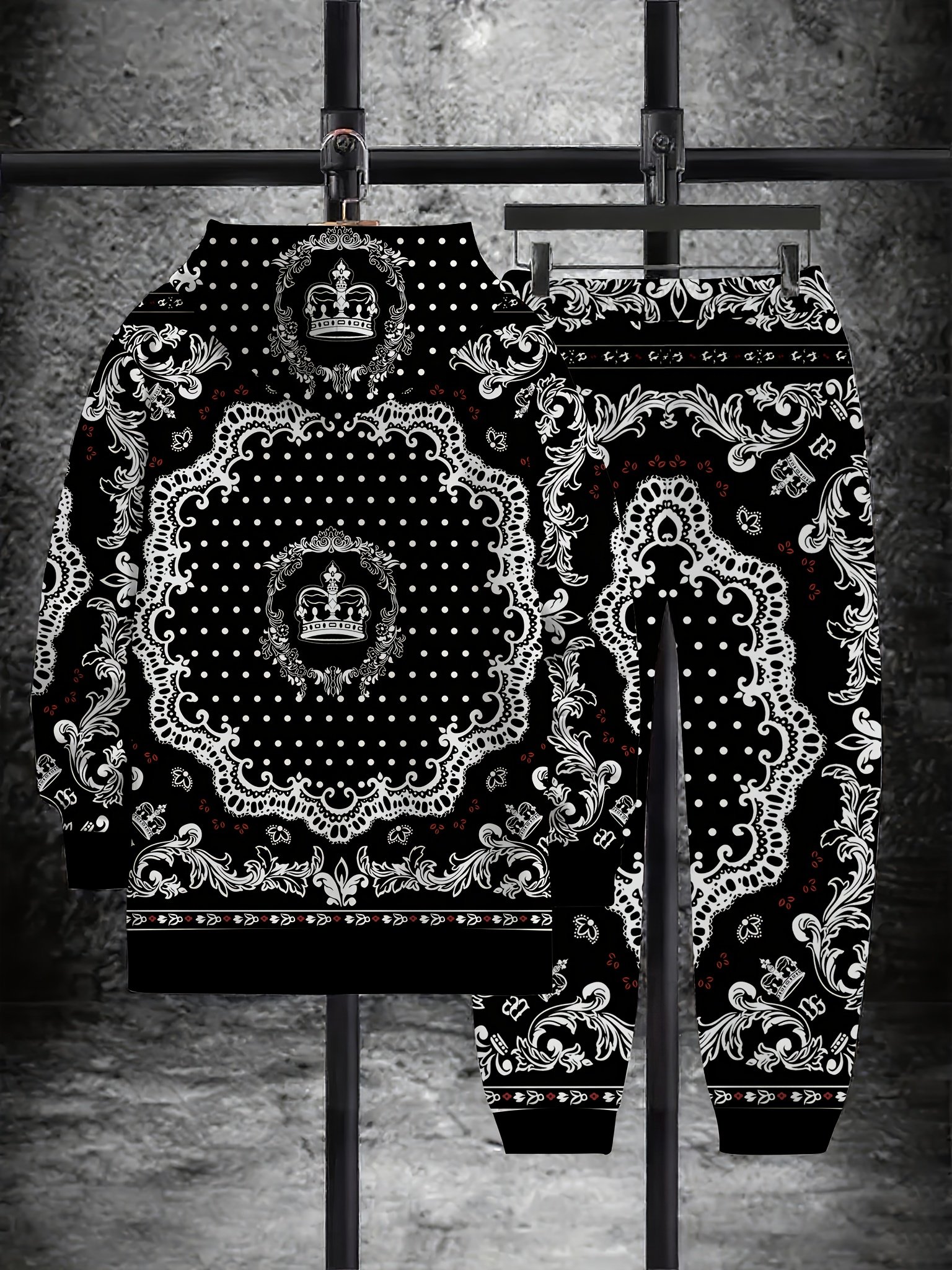 Men’S Ethnic-Inspired Geometric Print Hooded Sweatshirt & Jogger Set – Cozy Fleece Pullover with Kangaroo Pocket, Black & White Pattern, Perfect for Fall/Winter Casual Wear, Autumn Winter Apparel | Ethnic Pattern Outfit | Comfortable Fit