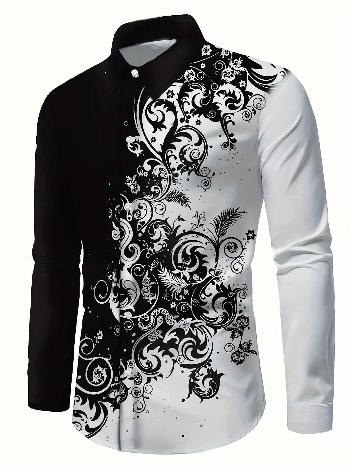 Men’S Floral Print Dress Shirt – Stylish Long Sleeve, Button-Up with Pockets, Black & White Design for Business Casual, Spring/Summer Wear, Casual Dress Shirt | Sleek Formal Attire | Polyester Fabri