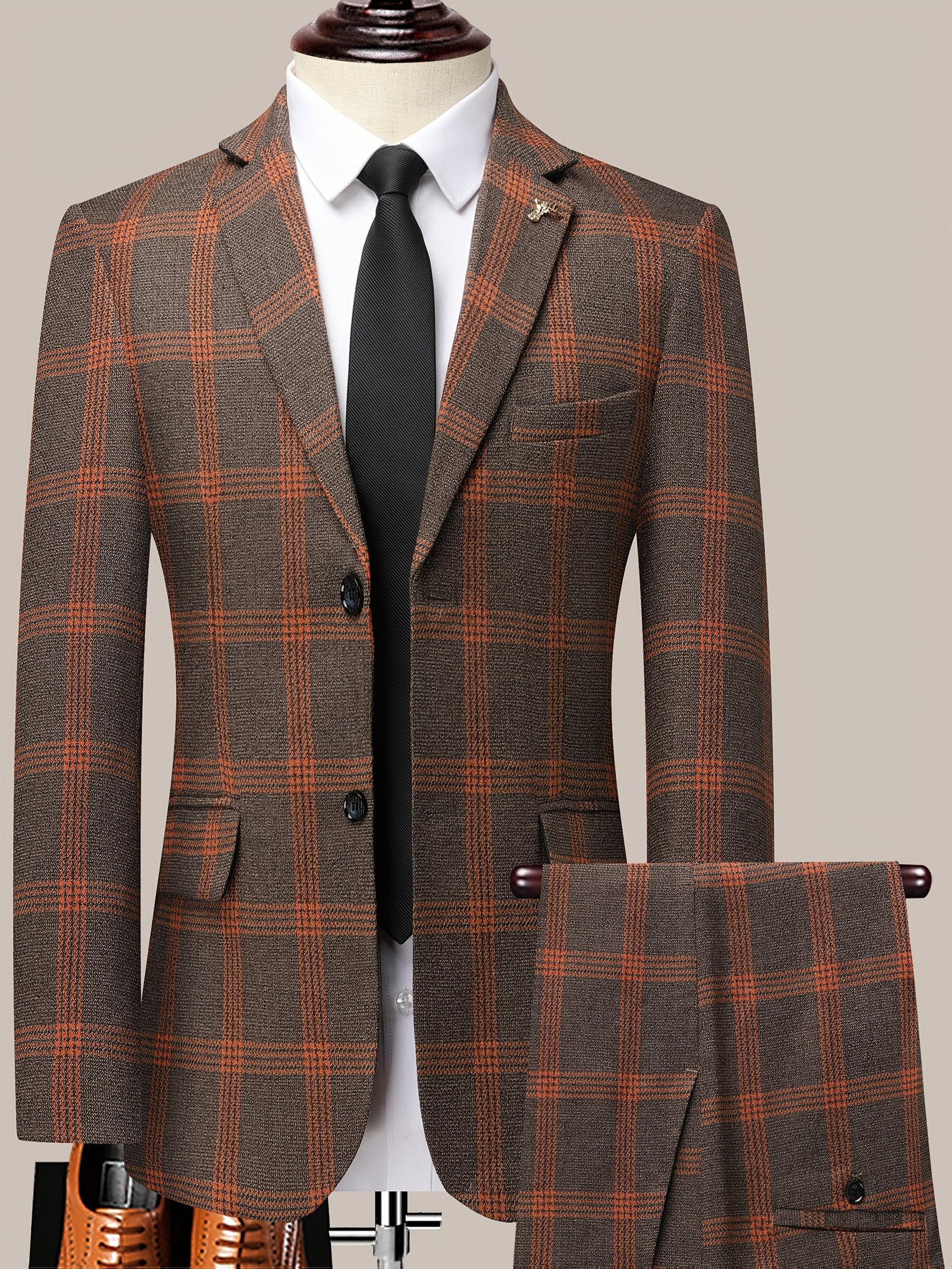 mens checkered suit set fit business casual two piece anti wrinkle iron free double breasted suit
