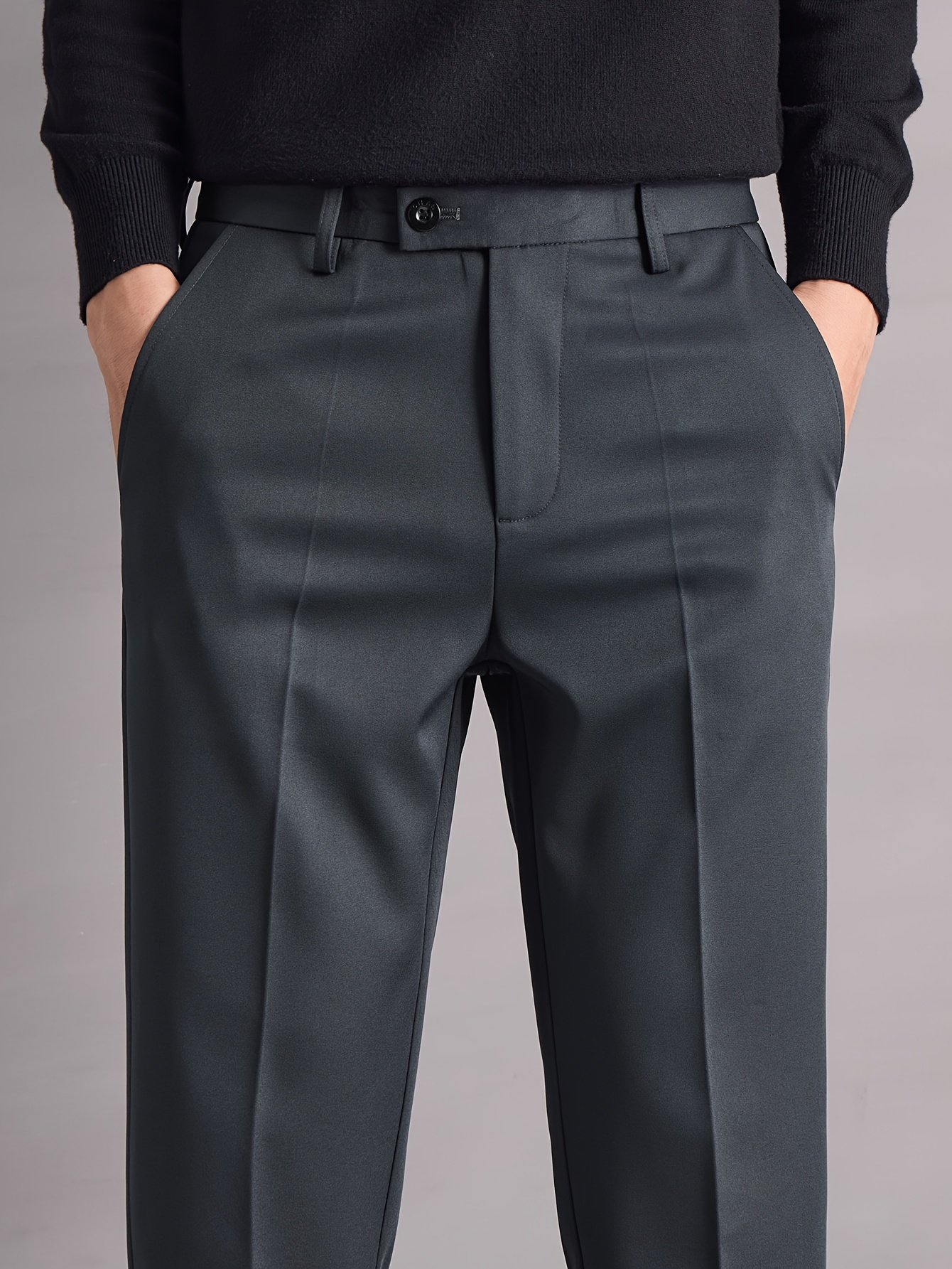 mens business formal dress pants straight leg dark grey black trousers wrinkle resistant machine washable for office semi formal casual attire office trousers professional attire modern menswear fabric stitching lightweight trousers stylish men office workers