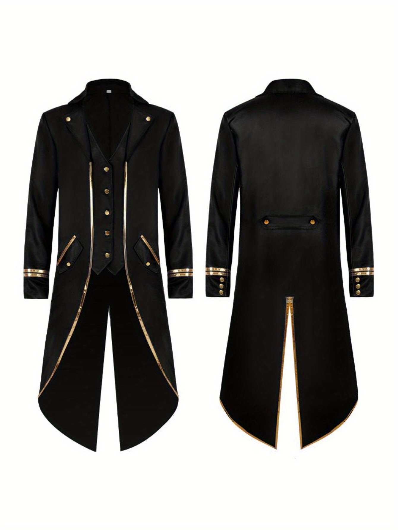 mens steampunk tuxedo jacket fit black costume coat with golden button details long sleeves lapel collar for gothic fashion themed parties gothic fashion jacket themed party attire vintage aesthetic sleek texture
