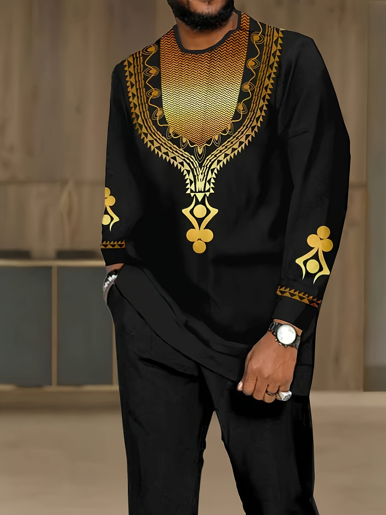 mens two piece set long sleeve t shirt pants black golden geometric pattern ethnic style regular fit with pockets casual wear for everyday attire comfortable clothing durable fabric