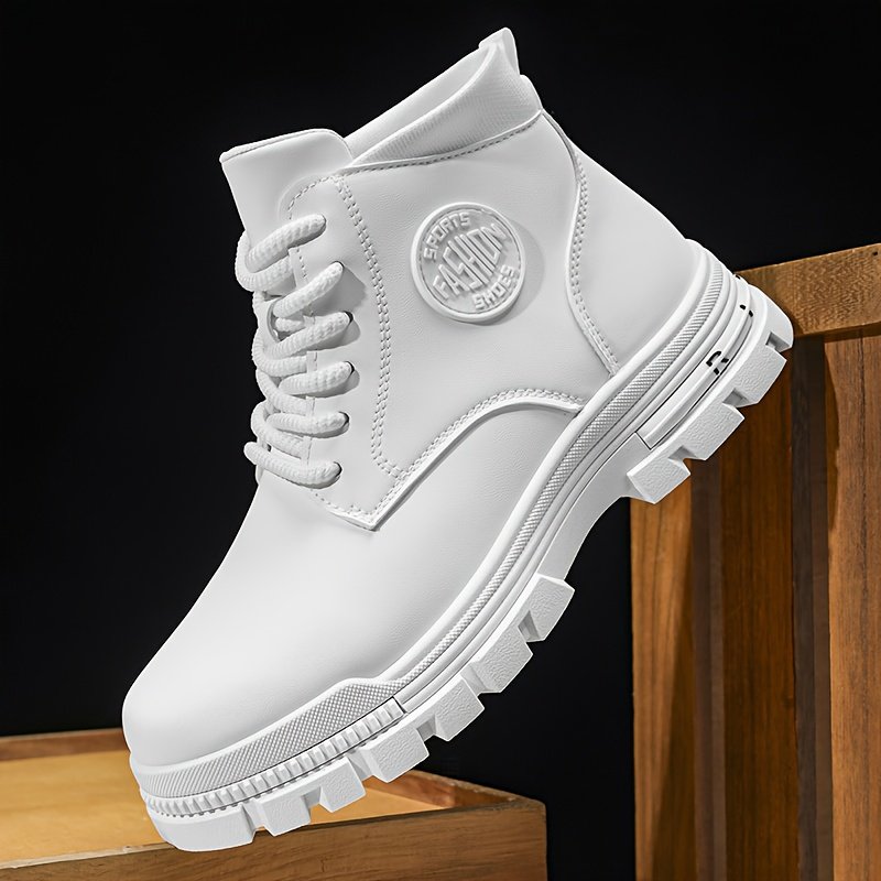Men’s White Boots – Mid-Calf Height Chunky Sole Rugged Traction Tread, Lace-Up Round Toe Winter & Autumn Boots for,M Casual & Casual Attire – Comfortable Durable Boots for Men with Cushioned Insole & Arch, Solid White PU Upper & PVC Sole, Ideal for & Urban Adventures, Winter Boots For Men, Shoes For Men High Quality, Mens Thick Sole Shoes Boots, Barefoot Boots, Mens Winter Boots, Shoes For Men High Top Shoes For Men, Tactical Boots For Men, Dress Shoes For Men,