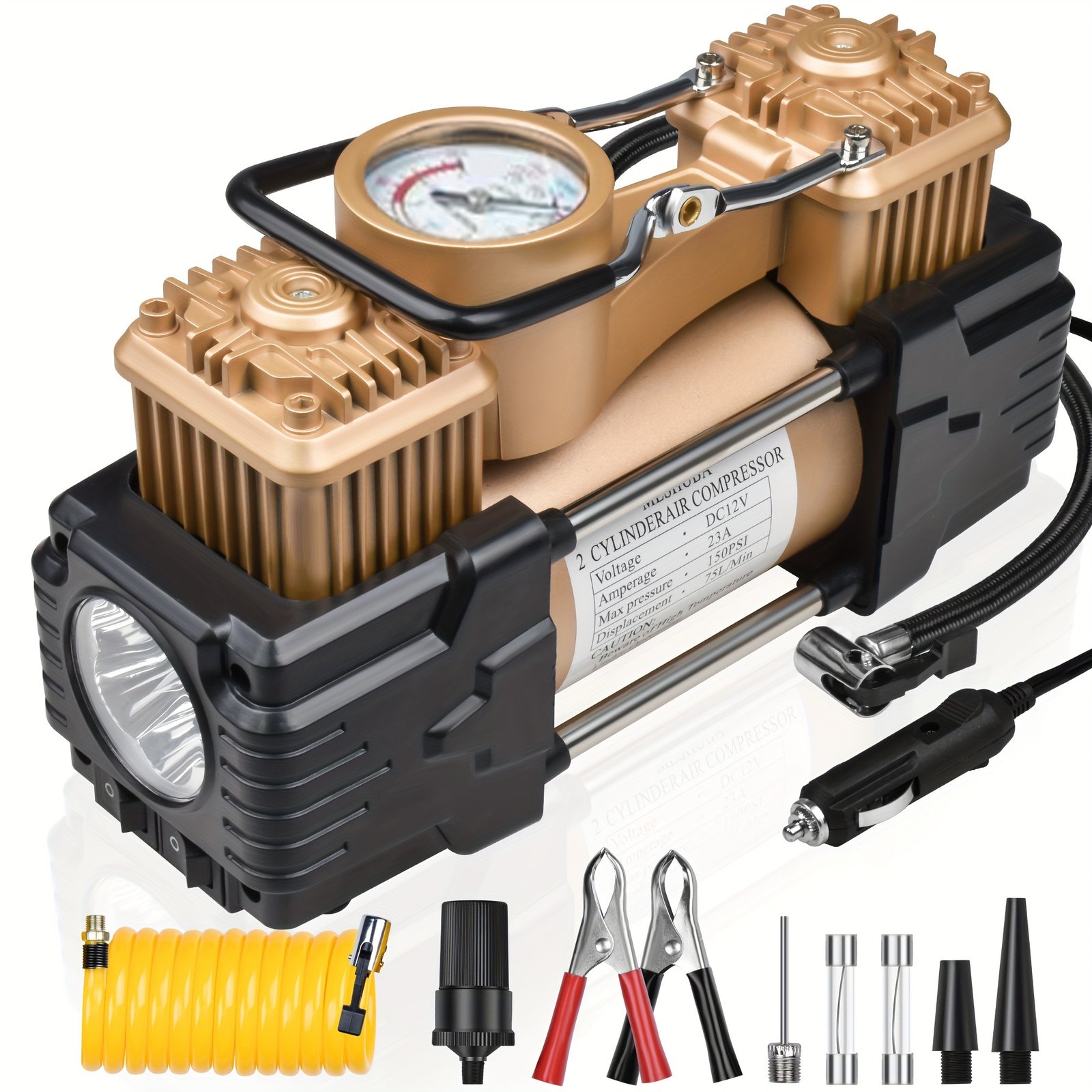 heavy duty 12v portable twin cylinder air compressor with digital gauge light 12v 24v 36v compatible car plug plug in carry bag accessories included emergency tire inflator for cars suvs balls inflatable boats pool accessories car jacking 15 minute cooling cycle 50 psi max durable portable design with cylinders control panel