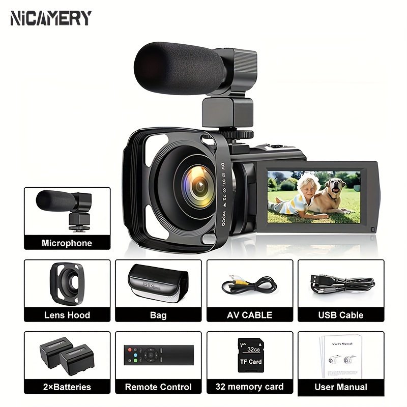 Nicamery Hot Camcorder, 16x Efficient Zoom 1080P HD Camcorder, Full HD 2400 Pixel Webcam Digital Camera, Sound Card Graphics Card Dual Support, Touch Screen Camcorder with Microphone DV, Remote Control, Lens Hood, 1000mAh Batteries 2pcs, 32G TF Card. The Right Choice to Send Relatives And Friends, Atmospheric And Upscale, Make Your Family And Friends Praise.icamery
