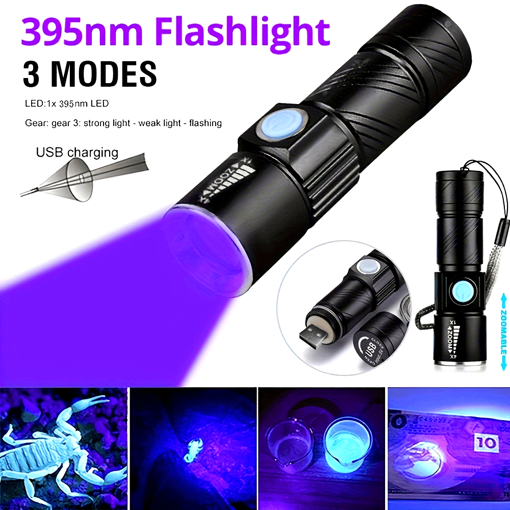 One UV 395nm flashlight, USB rechargeable, adjustable focus UV light, 3-speed mini flashlight, UV light, used for pet detection light, home, outdoor, camping, fishing light