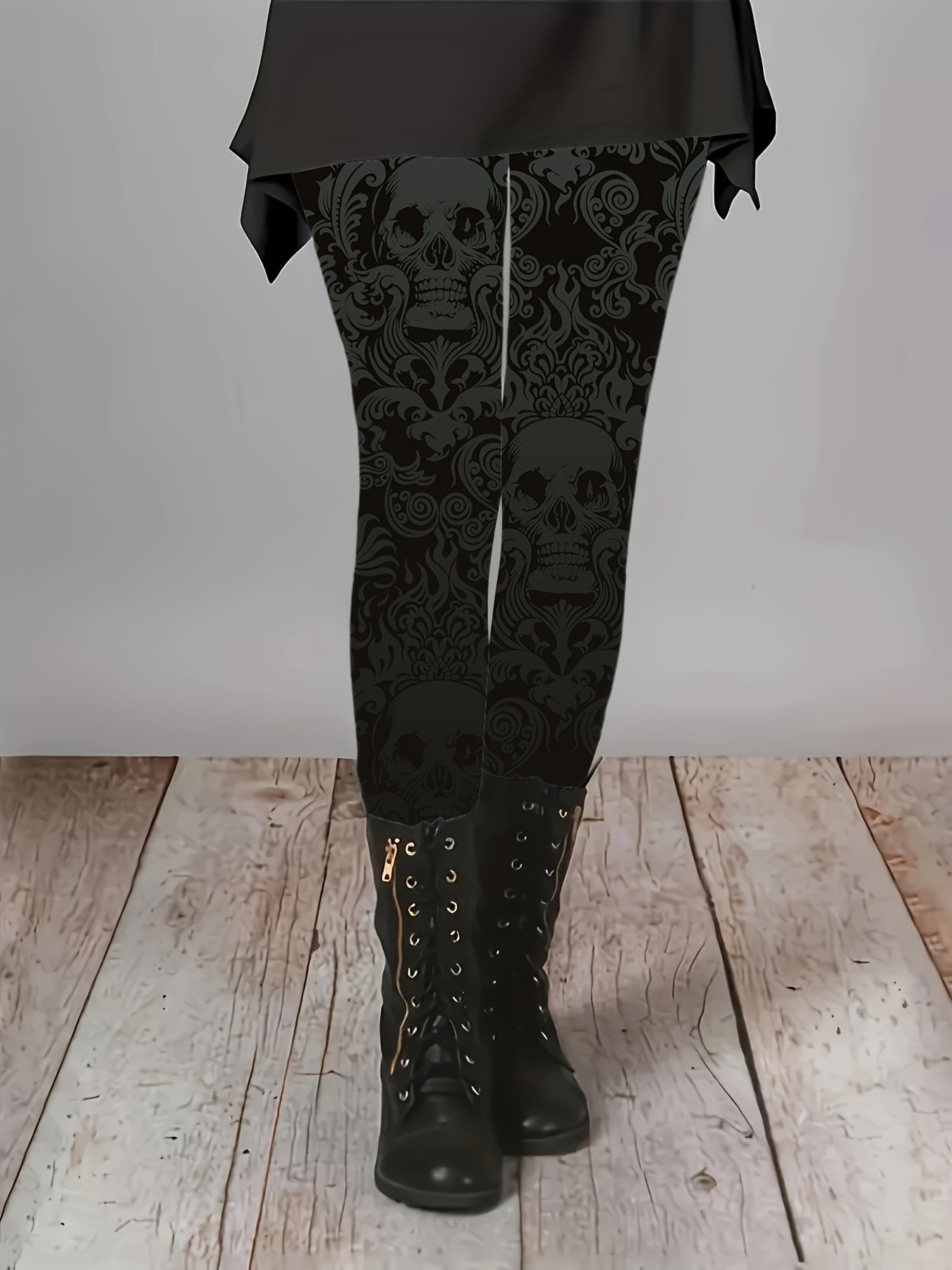 Plus Size, Women’s Plus Size Gothic Bohemian Skull Print Leggings – High-Waisted Stretchy Pants with Elastic Waist & Thigh Print, All-Season Machine Washable Black & White Gothic Design for Casual & Statement Outfits