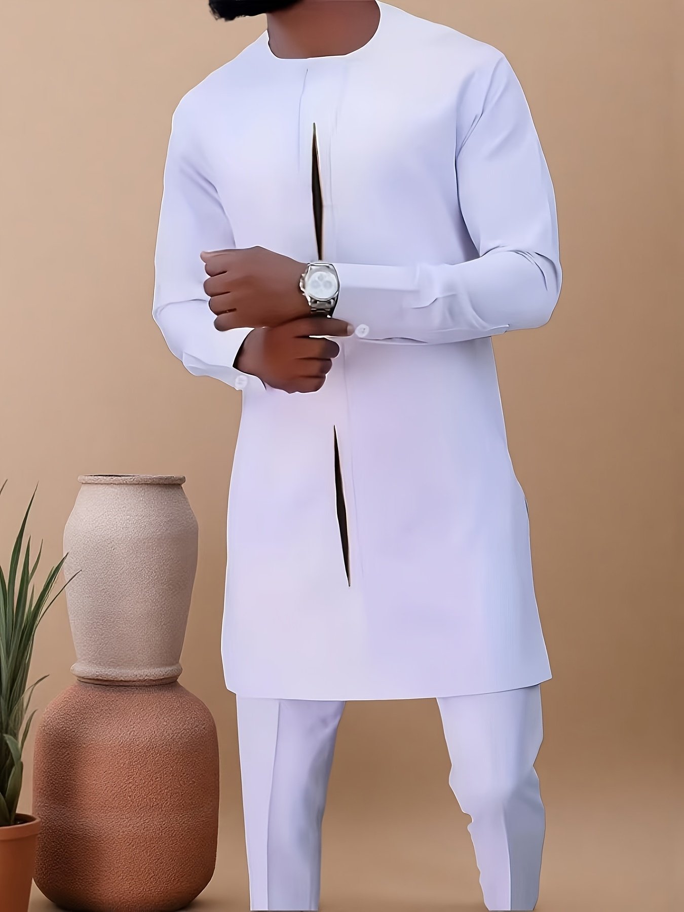 solid mens white two piece set long sleeve shirt pants with chest pocket regular cut print weddings parties and casual party attire nonstretch fabric