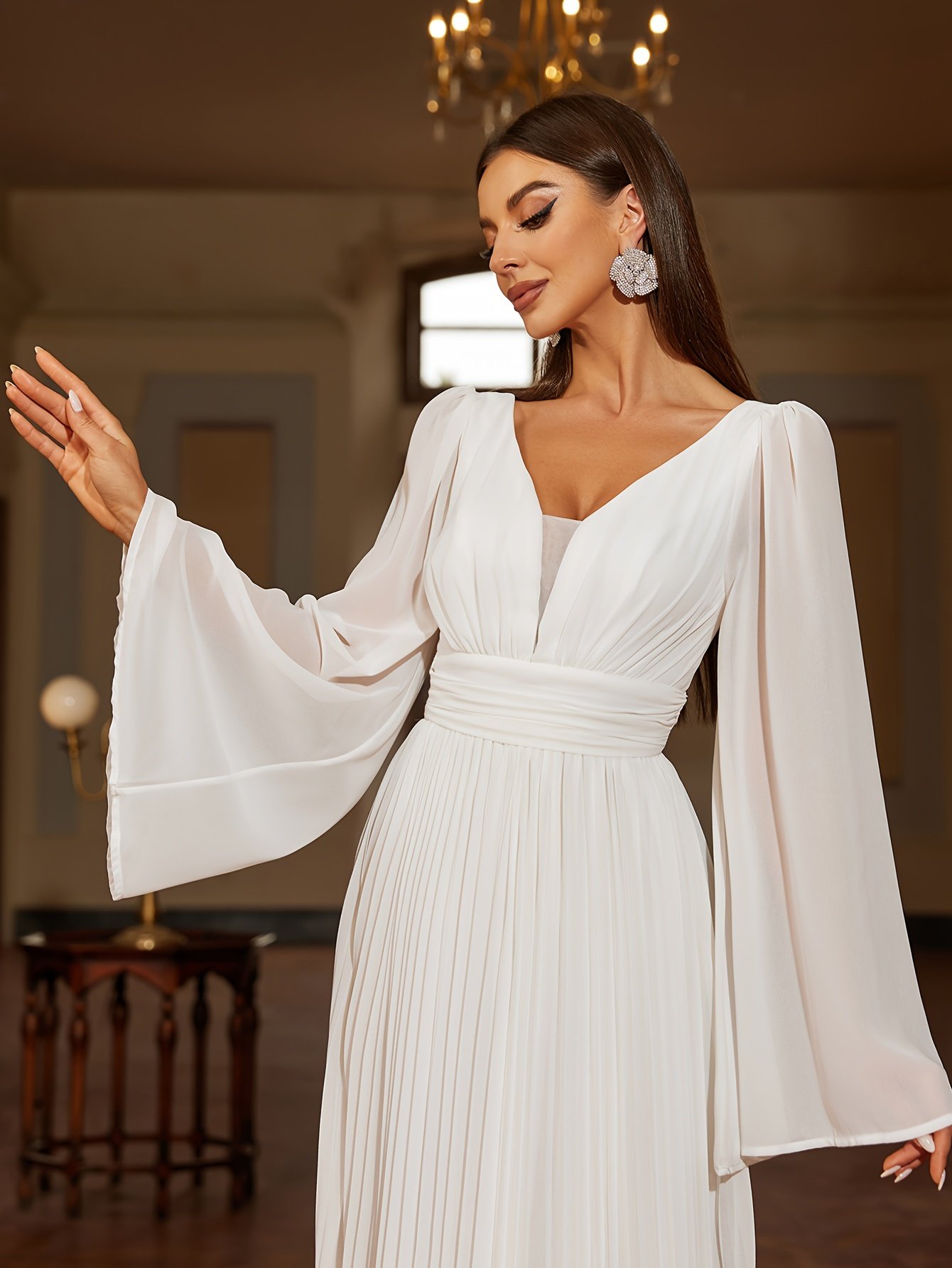 Solid V-neck Pleated Sweep Train Dress, Elegant Flare Sleeve Trumpet Dress For Wedding Party, Women’s Clothing