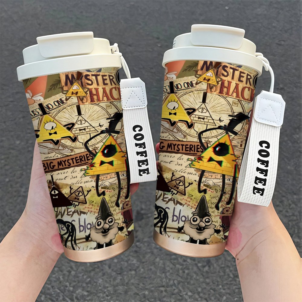 [Stainless Steel Tumbler] 1pc 18oz Stainless Steel Tumbler, Leak-Proof, Reusable, Hand Wash Only, Multipurpose Use, with Travel Lid and Strap, Gift Idea, Gravity Falls Bill Cipher Design