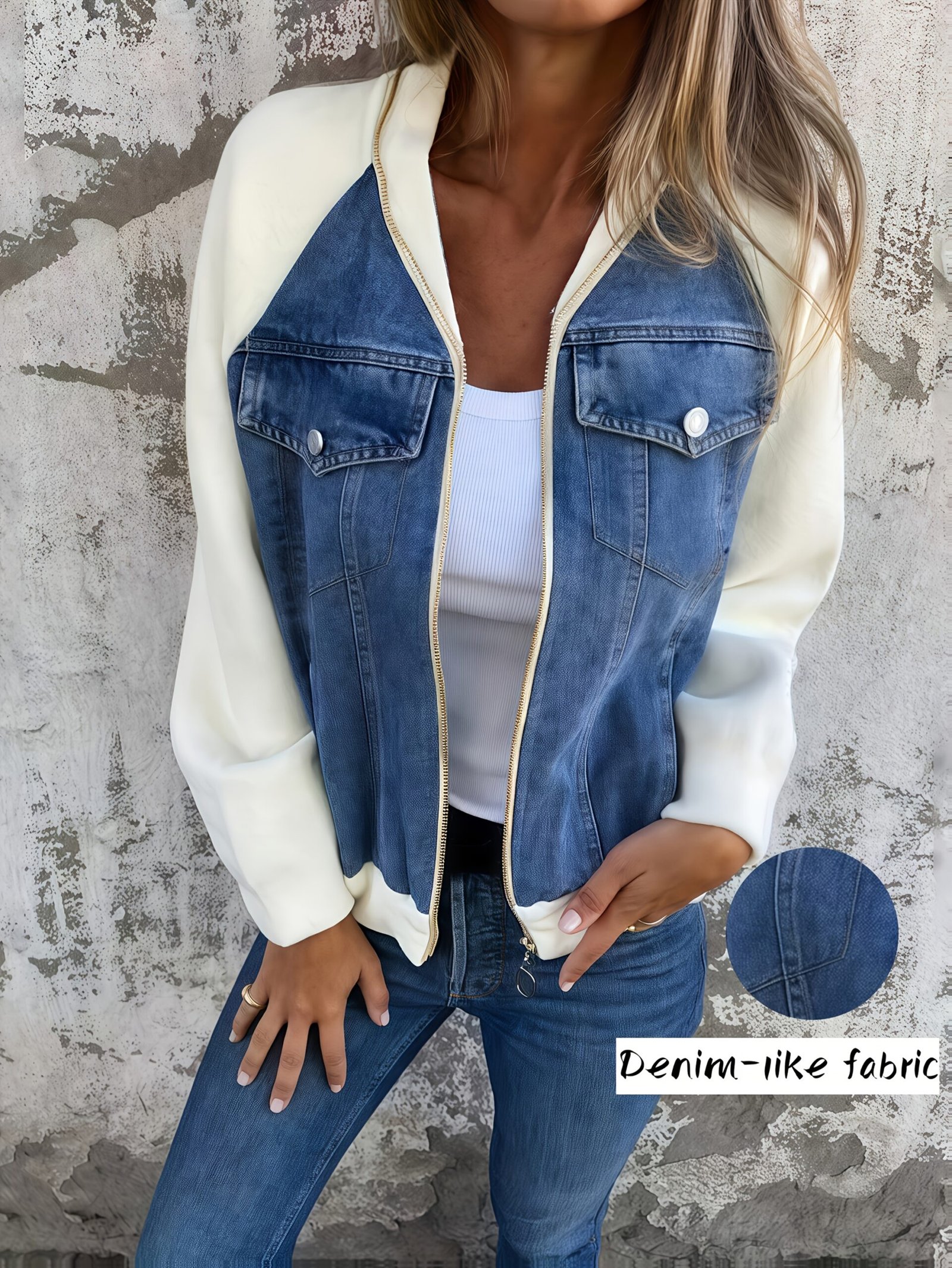 The New Imitation Denim Patchwork Jacket for Autumn And Winter 2025, with A Lapel Design And Zipper Style, Is A Casual And Stylish Long-sleeved Jacket, Which Is An Indispensable Item In The Fall And Winter Season